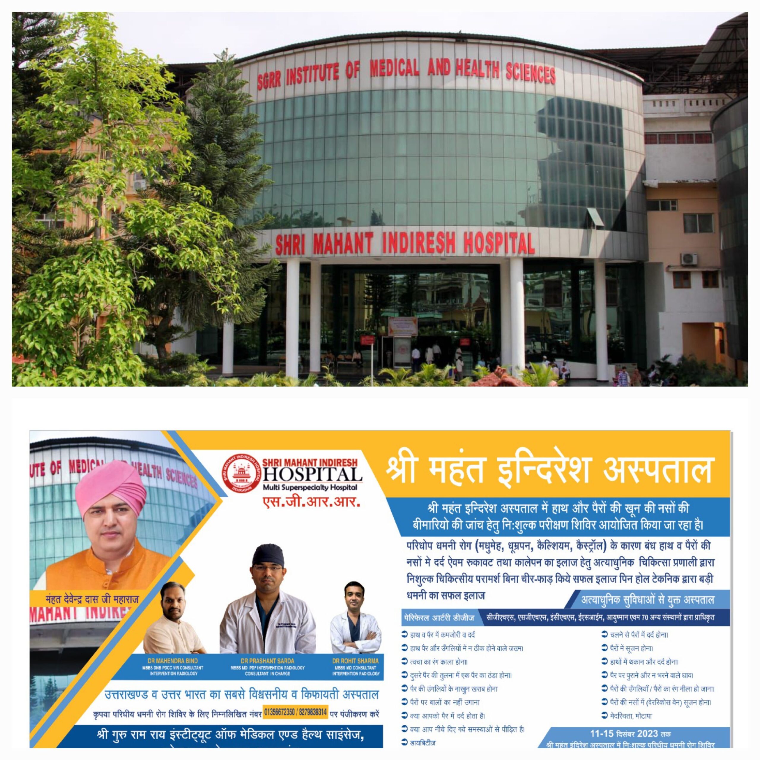 कृपया परिधीय धमनी रोग शिविर के लिए निम्नलिखित नंबर 01356672350 / 8279839314 पर पंजीकरण करें (श्री महंत इन्दिरेश अस्पताल)
