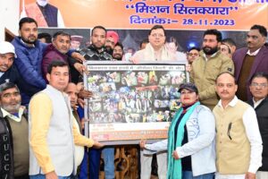 मुख्यमंत्री कैम्प कार्यालय स्थित मुख्य सेवक सदन में आयोजित ‘आदर अभिनन्दन, आभार मिशन सिलक्यारा’’ कार्यक्रम में श्रमिक संगठनों द्वारा मुख्यमंत्री का आभार व्यक्त किया गया। मुख्यमंत्री पुष्कर सिंह धामी ने कहा कि उत्तरकाशी के सिलक्यारा सुरंग से 41 श्रमिकों को सकुशल निकालने के लिए सिलक्यारा रेस्क्यू में लगी केन्द्र एवं राज्य सरकार की सभी एजेंसियों द्वारा सराहनीय कार्य किया गया। इस मुश्किल घड़ी में श्रमिकों ने जो धैर्य रखा वो हम सभी को हमेशा प्रेरित करने का काम करेगा।